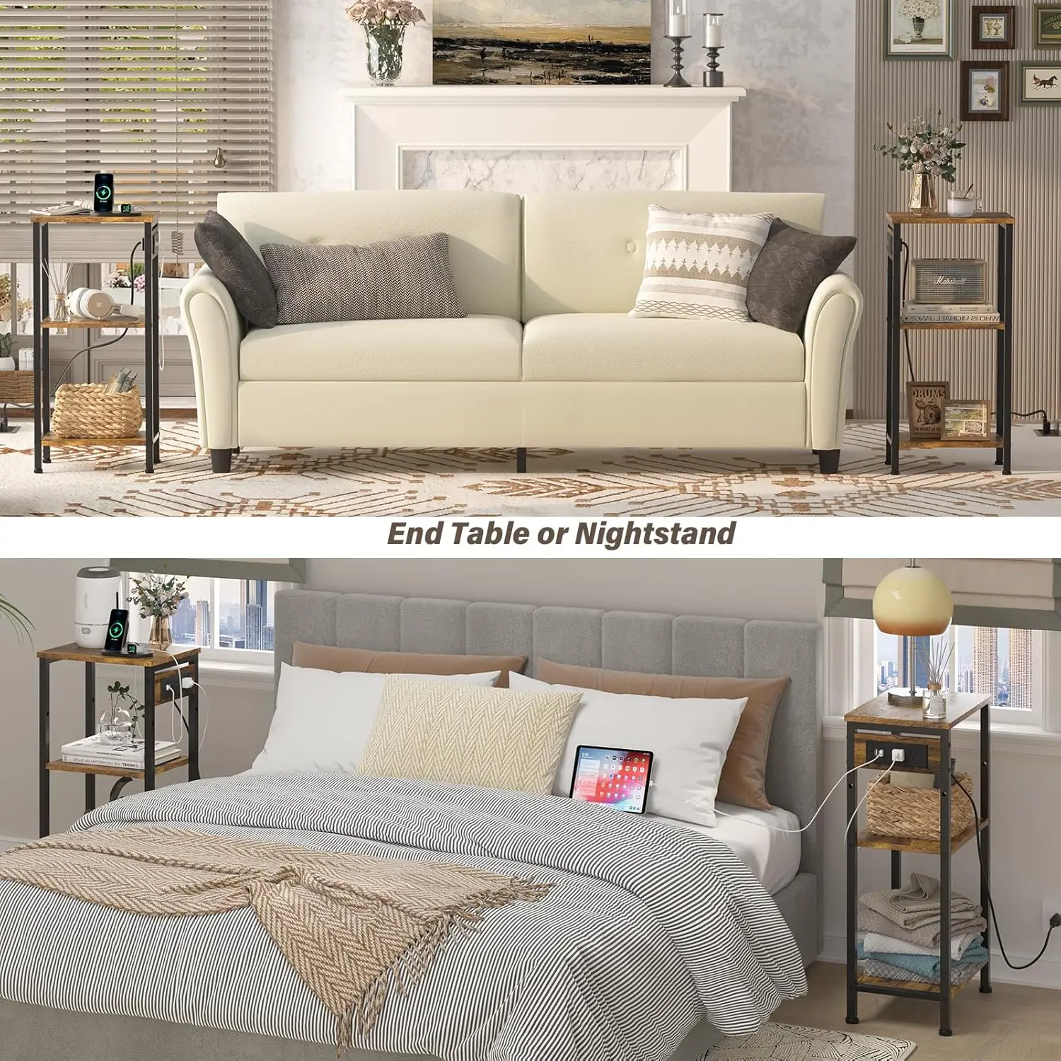 3-Tier Narrow Tall Nightstand with Charging Station, USB Ports and Outlets for Bedroom Living Room Office