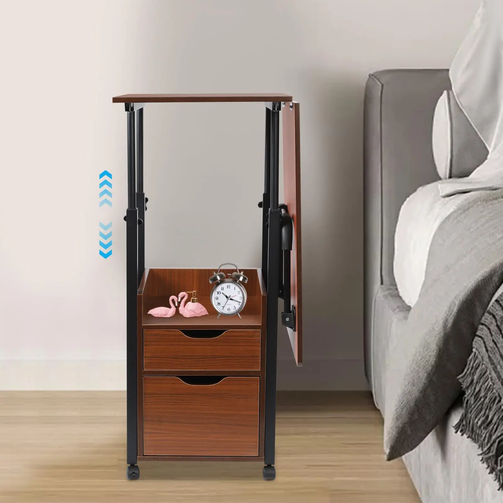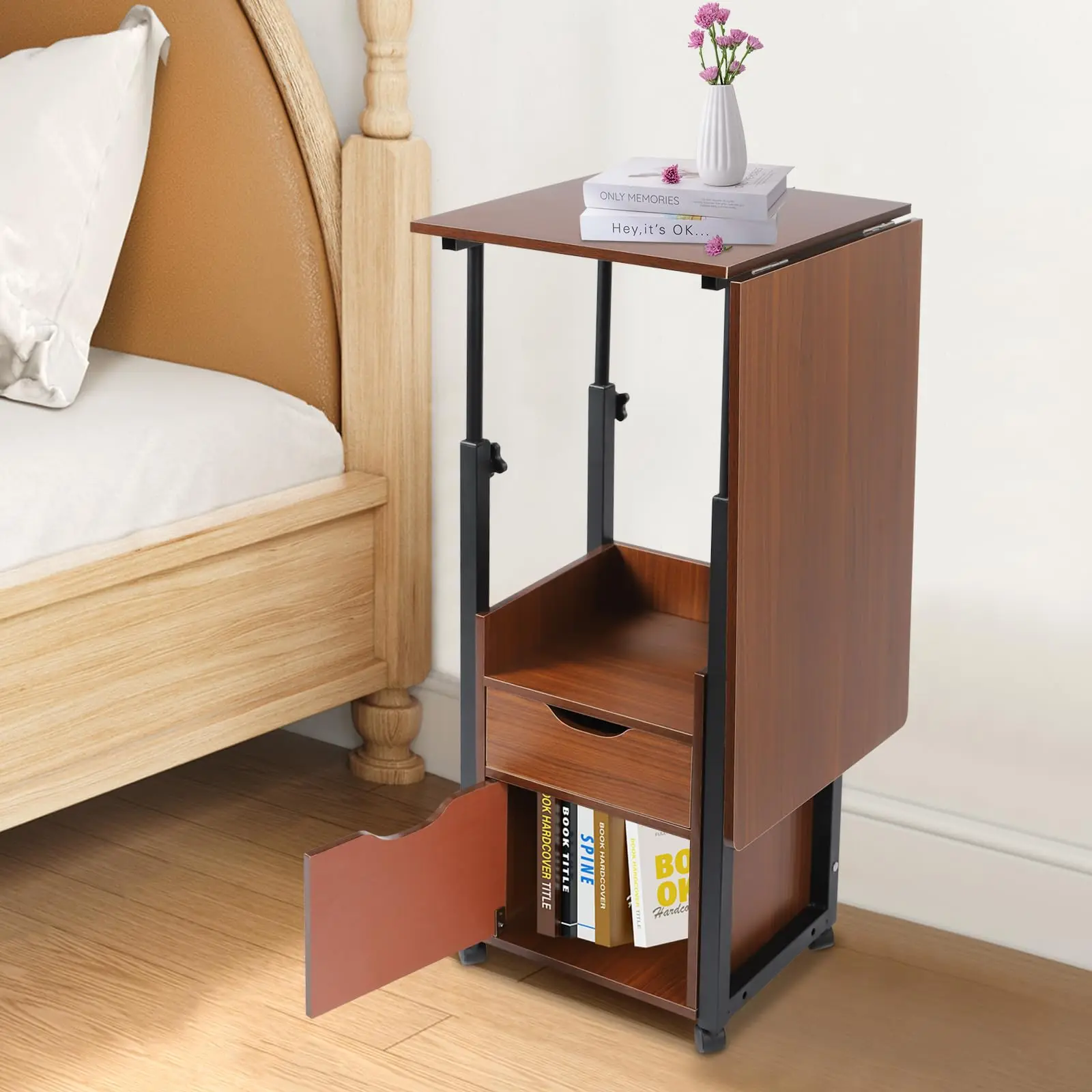 Overbed Table with Wheels, Foldable Overbed Bedside Table with Adjustable Height, Standing Overbed Rolling Table for Hospital Ho